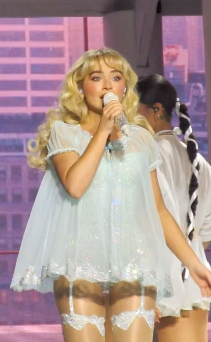 The three images above perfectly depict the aesthetic that Sabrina Carpenter is mainly known for. The pastels, sequins, sheer fabric, and a lot of sequins and glitter. She uses three main silhouettes for her tour. The first being the baby doll night gown with high garters, and showing her affinity for more delicate and softer looks. A more seemingly “innocent” look, but then bringing in the sexual component with the thigh-high garters. The second is a lingerie body suit with a thigh-high garter. In this specific instance, she shows off her iconic kissy lips motif. Carpenter takes pride in showing off her sensuality. The third is the more tame of outfits, but a two-piece matching set of a top and a short skirt.