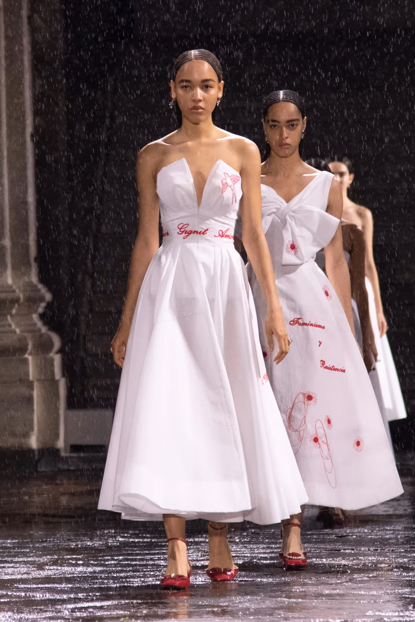 One of the most powerful and emotional moments of Maria Grazia’s tenure at Dior happened in May 2023 when she presented her Cruise collection in Mexico City. The show closed with a dramatic series of white dresses and red motifs embroidered while the song “Canción sin Miedo” (Song with no Fear) played in the background. This song was written by Vivir Quintana in 2020 to bring attention to femicides. In the first seven months of 2020, there were about 2,000 cases of femicides that were reported, and despite the protests, and advocacy, these numbers continue to be significantly high.