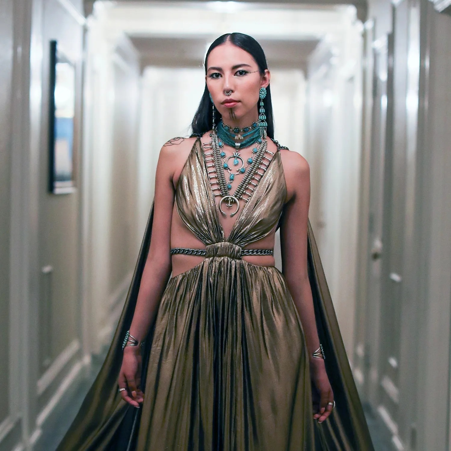 The first Met Gala that Quannah Chasinghorse attended was in 2021, when she was only 19 years old. She wore a beautiful flowing gold dress, coupled with turquoise and silver stacked accents calling back to her ties to the Navajo tribe. Much of the jewelry was sourced by her own aunt. Every year since, she’s been invited back, and every year since, she’s outdone herself.