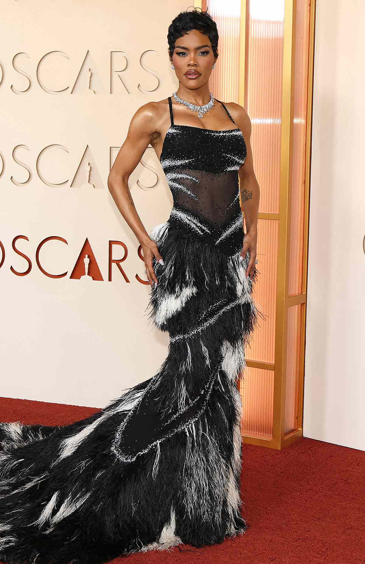 At the Vanity Fair After Party, several guests wore looks that were strikingly rich in texture. Demi Moore's Balenciaga ensemble featured leather gloves and a dramatic feathered train. Wunmi Mosaku wore a lavender Louis Vuitton dress, beautifully embellished and tailored around her pregnant belly, finished with an organza cape. Pink Panthere also turned heads in a black dress with a playful, unexpected take on feathers.