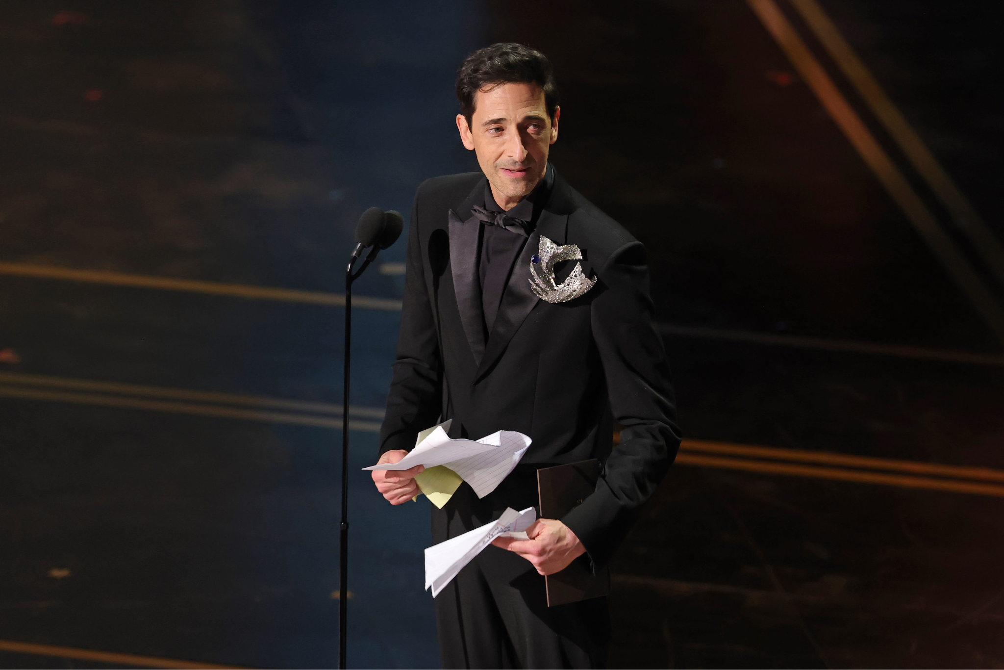 Male politicians typically wear lapel pins to signal their values — an American flag, or a cause-specific emblem to draw attention to an issue. In Hollywood, the comeback of the brooch — an accessory with a history spanning thousands of years — arrives at a moment of desperate need for self-expression. Amid ongoing efforts to make fashion more inclusive, the Oscar dress code still requires men to wear tuxedos. Those tuxedos allow for creativity in fabric, color, and silhouette, but the brooch adds an additional layer: personality, sparkle, elegance, or joy — whatever the wearer wants to communicate. This is perhaps the most accessible trickle-down trend of the season, one we could easily see knocked off by H&M within months, with affordable brooches hitting the market just in time for prom this May.